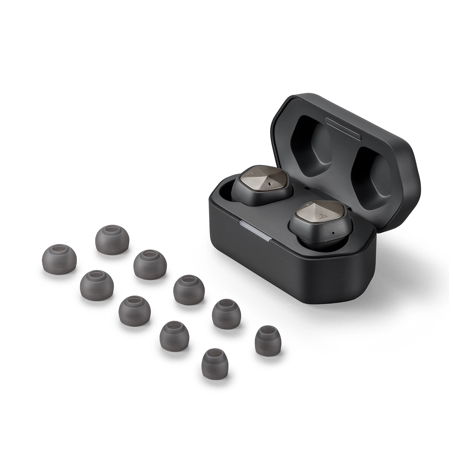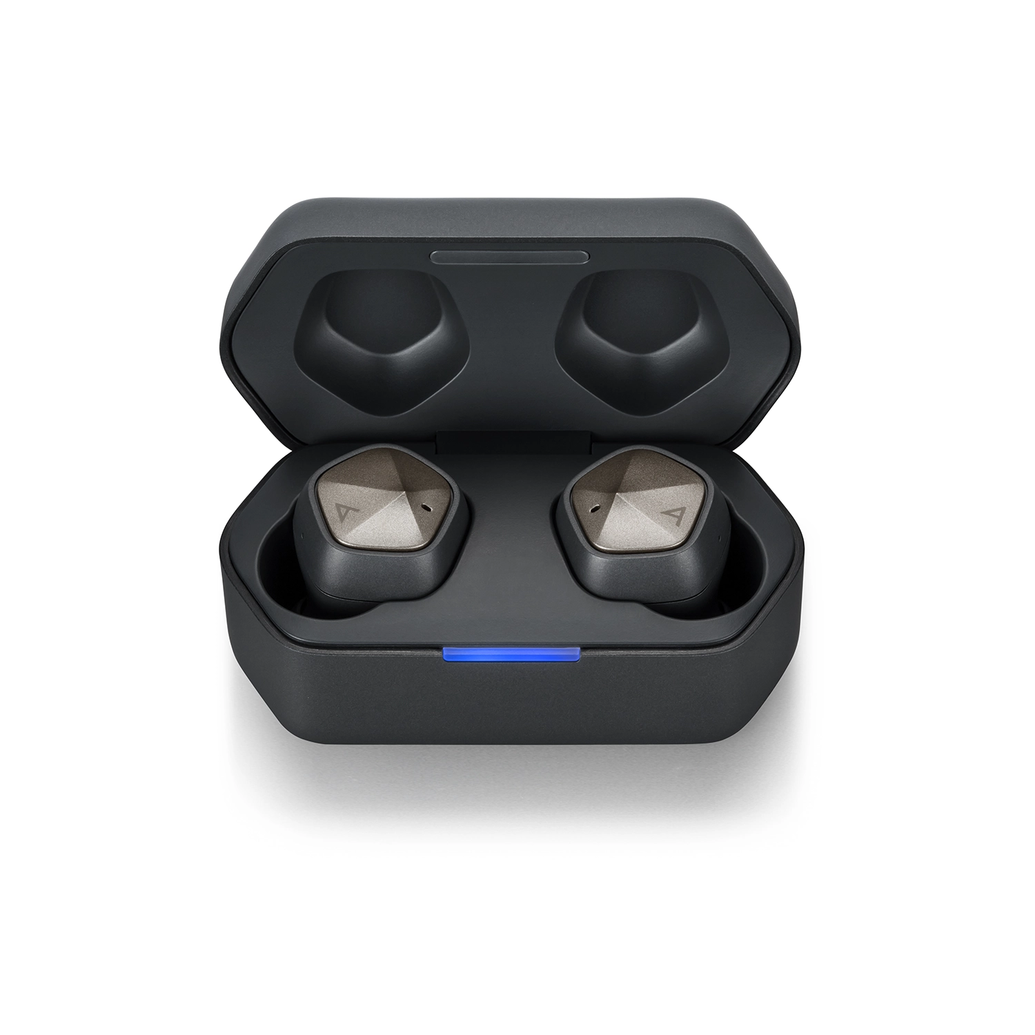 Konstrukcja etui ładującego AK UW100MKII łączy w sobie obie słuchawki w kształcie pięciokąta, reprezentujące ciągłość światła i cienia – tożsamość Astell&Kern.
