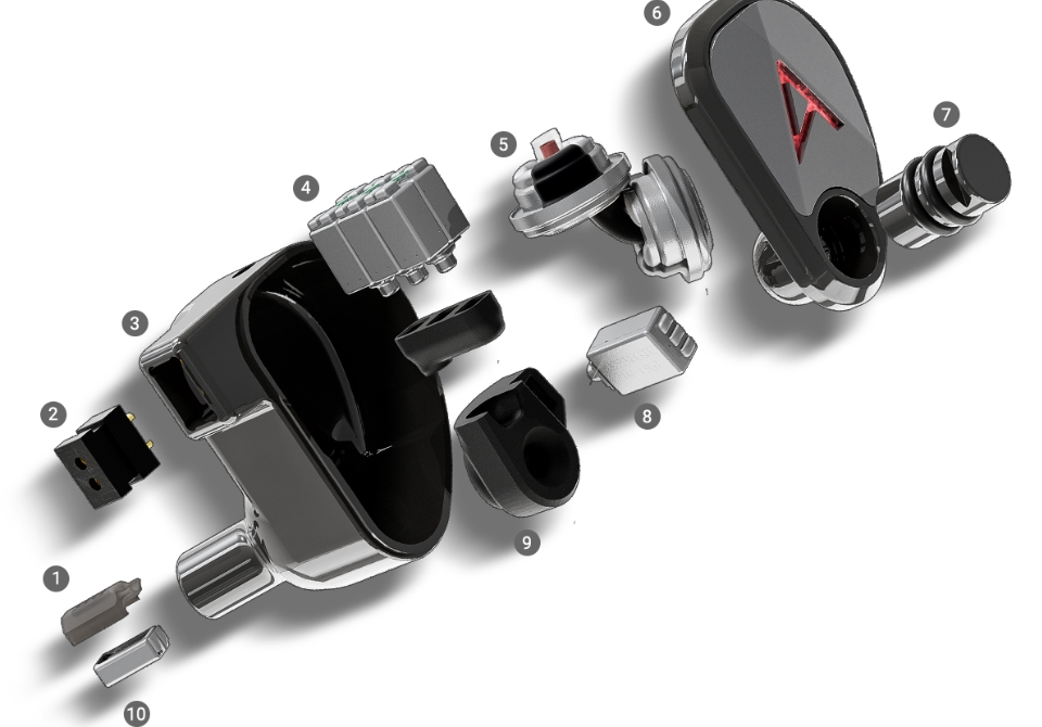 Średnie i wyższe średnie częstotliwości są obsługiwane odpowiednio przez sześć i jeden przetwornik typu balanced armature (BA). Taka konfiguracja zapewnia płynne przejścia tonalne i bogatą fakturę dźwięku.