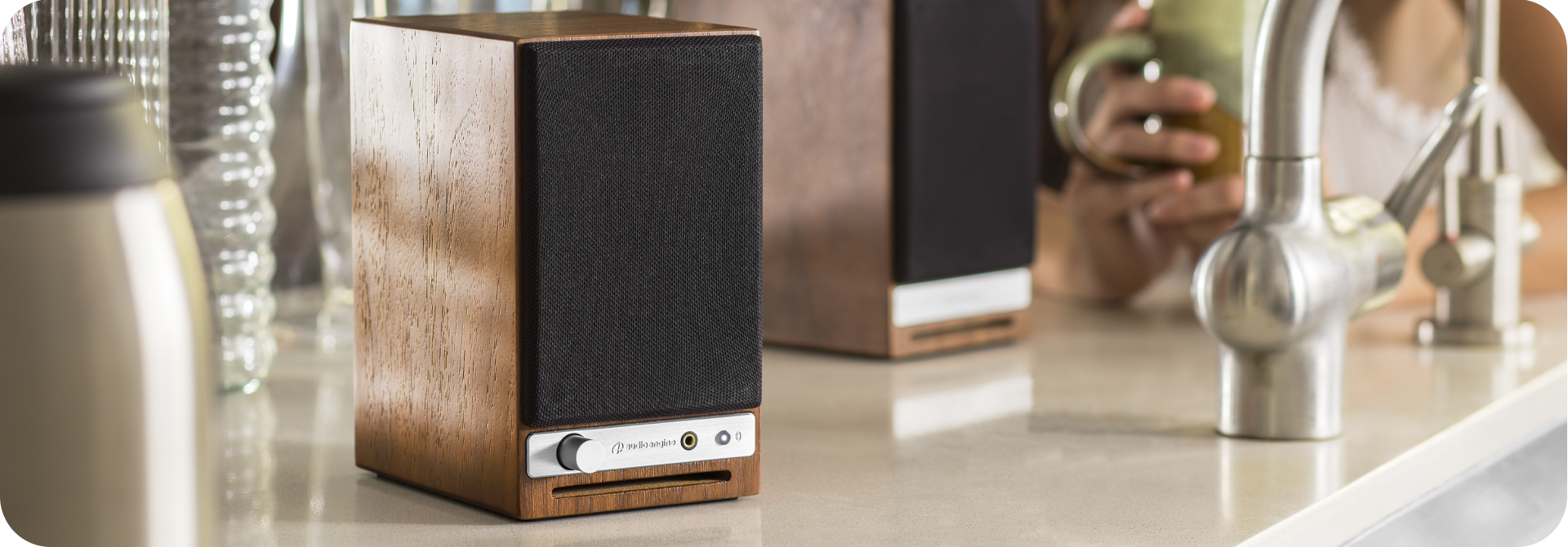 Zintegrowanie głośników ze wzmacniaczem eliminuje konieczność instalacji i podłączania zewnętrznego wzmacniacza, pozwala też zaoszczędzić sporo miejsca. Lewy głośnik podłączamy do gniazdka sieciowego, a prawy głośnik łączymy z lewym dołączonym do zestawu kablem. Wszystkie wewnętrzne elementy systemu zostały ze sobą precyzyjnie zestrojone, tak aby zapewnić doskonały dźwięk bez konieczności dopasowywania do siebie wzmacniaczy i klasycznych głośników.