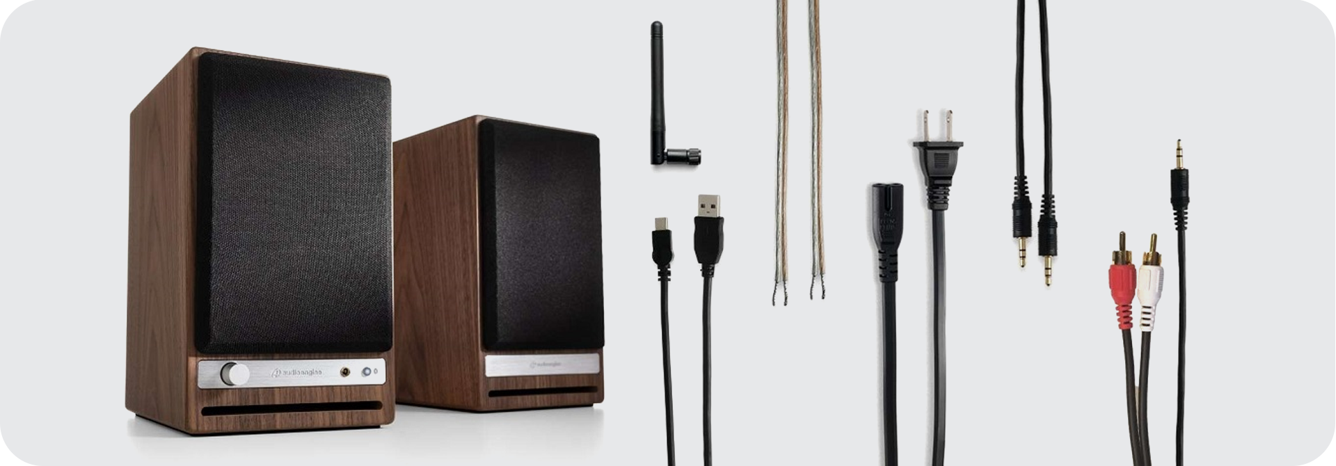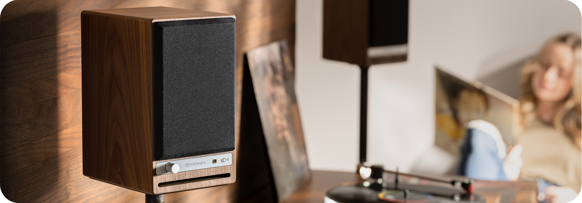 - Wbudowane wzmacniacze mocy umieszczone w precyzyjnie dostrojonych, ręcznie tworzonych i wykończonych obudowach z drewnianego forniru.