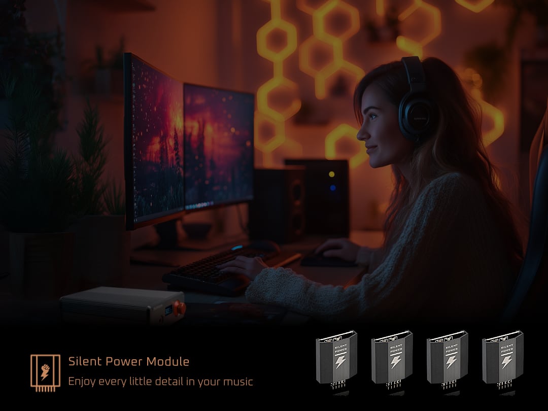 Dodatkowo, wewnętrzny obwód zasilania wzbogacono o moduły Silent Power – dostępne w wersjach SP01 lub SP02 – które pełnią rolę zaawansowanych regulatorów napięcia. Charakteryzują się one ekstremalnie niskim poziomem szumu, wynoszącym zaledwie 0,8 nVrms, co przekłada się na wyjątkową przejrzystość i precyzję brzmienia.