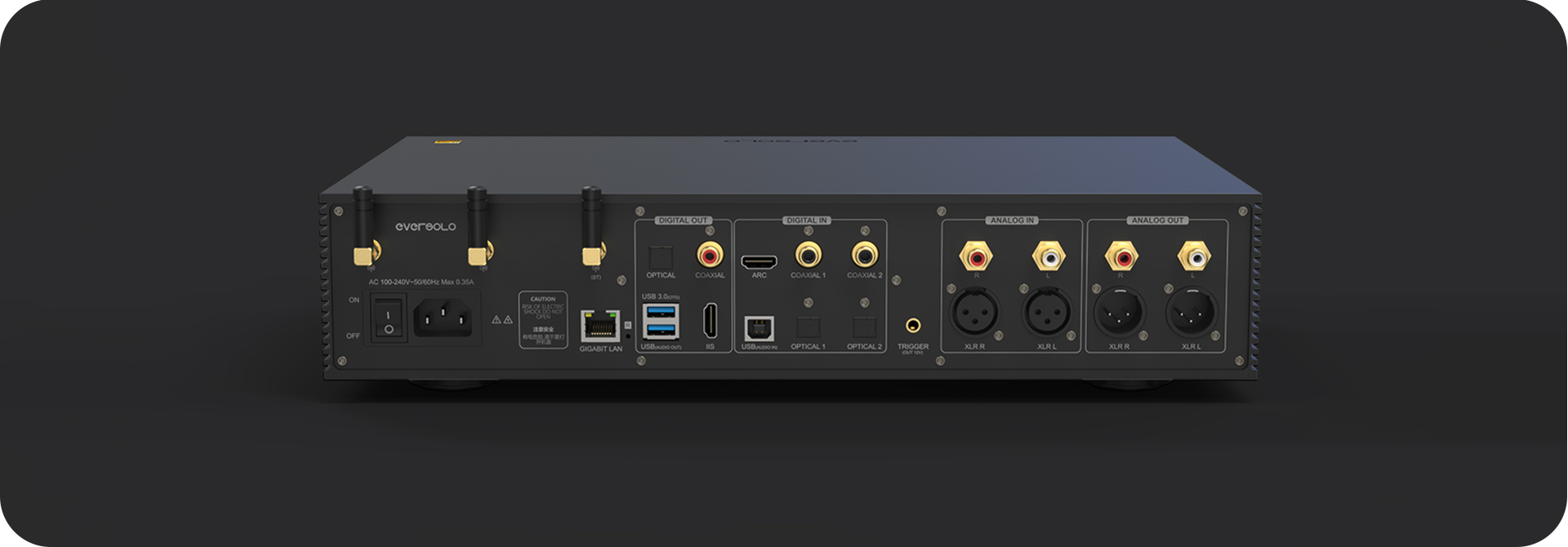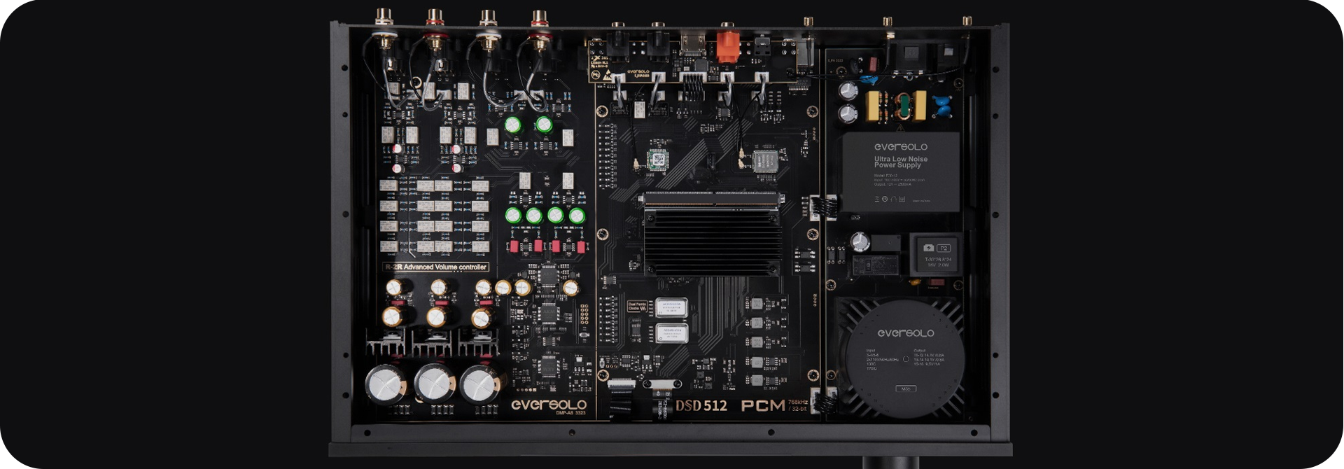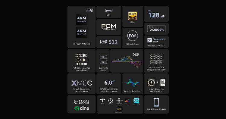 Autorski silnik audio EOS (EverSolo Original Sampling-rate), układ DAC AKM AK4499EX z regulatorem AK4191EQ, 16-rdzeniowy kontroler USB XMOS, dwa niezależne femtosekundowe zegary oraz system kontroli głośności na drabince R2R gwarantują rewelacyjną jakość dźwięku. Duży, 6-calowy ekran dotykowy oraz aplikacje towarzyszące na systemy Android, iOS i iPadOS umożliwiają dodatkowo wygodną obsługę urządzenia.