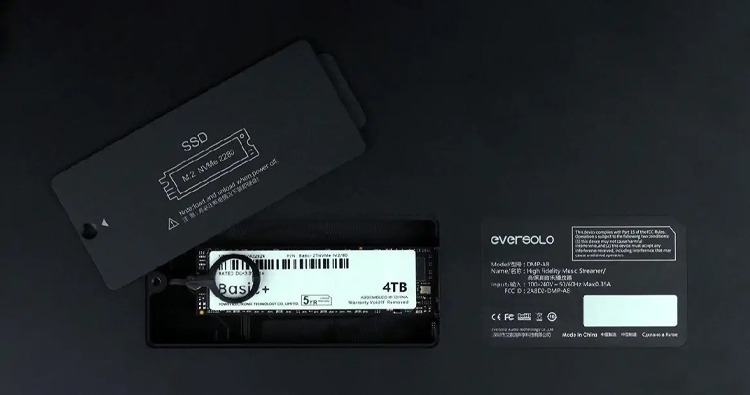 DMP-A8 ma slot dla pamięci M.2 NVME SSD, który umieszczono na dolnej części urządzenia. Umożliwia to prostą, samodzielną instalację nośników SSD, bez konieczności otwierania obudowy. Model obsługuje pamięć SSD o pojemności do 4 TB, dzięki czemu można cieszyć się szybką i stabilną przestrzenią dyskową na lokalną kolekcję plików audio wysokiej jakości. Dodatkowo, DMP-A8 umożliwia podłączenie zewnętrznych nośników danych przez port USB OTG.