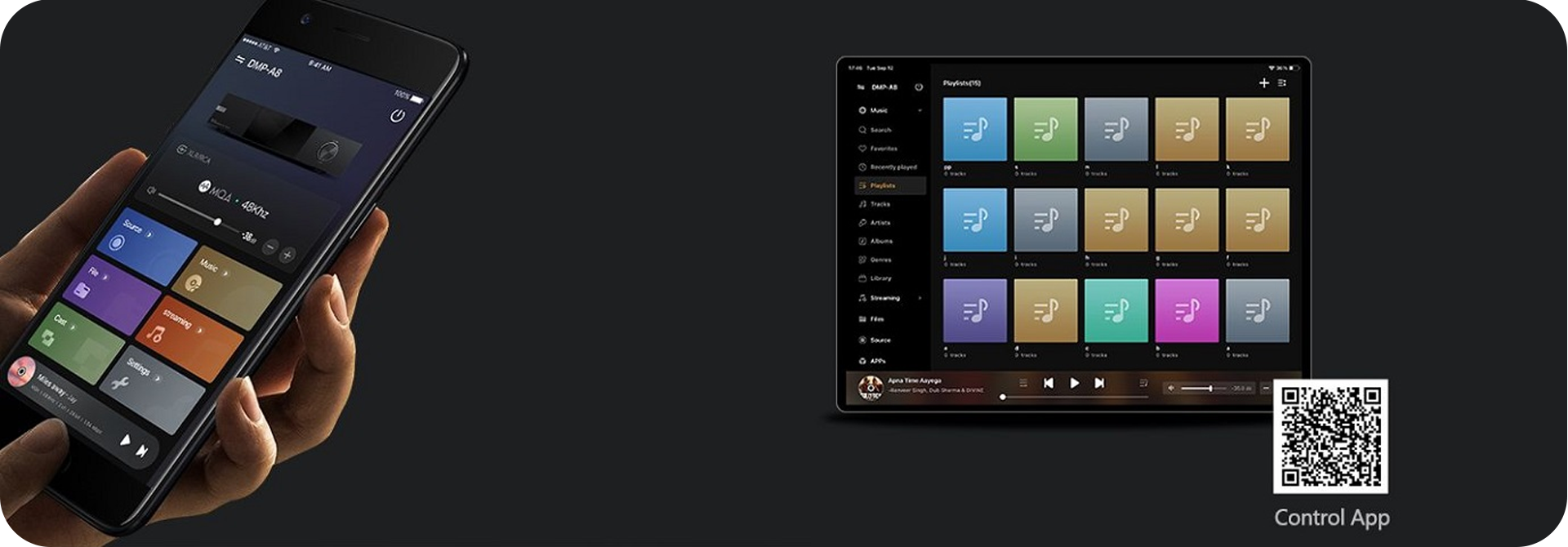 DMP-A8 to streamer, który obsługuje protokoły transmisji Tidal Connect i DLNA, a także wiele innych standardów. Umożliwia to wybór muzyki w aplikacji na urządzeniu mobilnym i jej przesył do DMP-A8 podłączonego do sieci lokalnej. To niezwykle wygodny sposób zarządzania ulubioną muzyką, w tym utworami w wysokiej jakości.