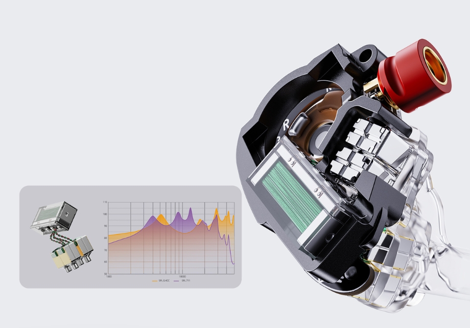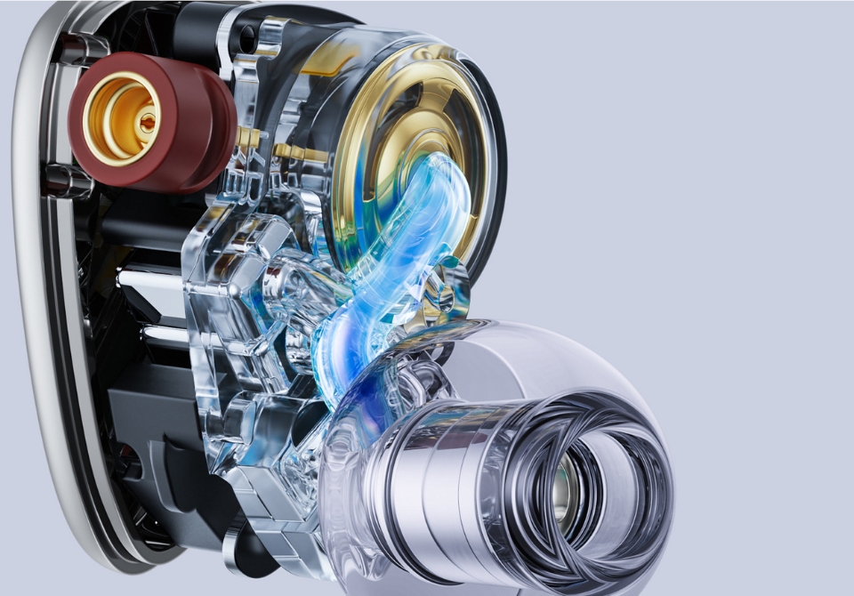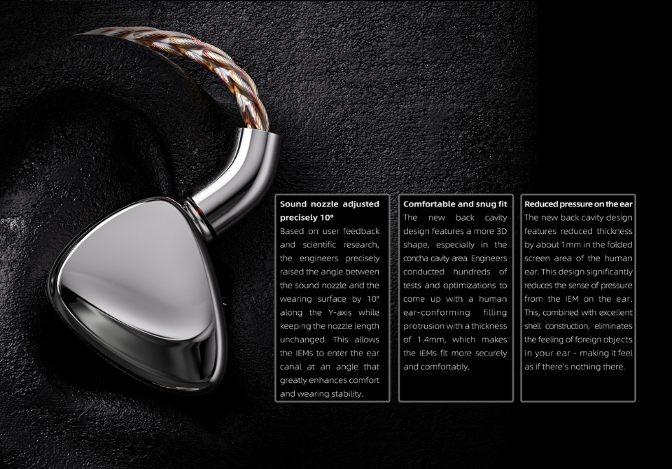 Aby jeszcze bardziej poprawić komfort użytkowania, konstrukcja tylnej wnęki została udoskonalona poprzez zmniejszenie jej grubości o około 1 mm w kluczowych obszarach anatomicznych ucha. Dzięki temu odczuwane ciśnienie IEM-ów na ucho jest znacząco redukowane. W połączeniu z precyzyjnie dopracowaną muszlą użytkownik ma wrażenie lekkości – jakby w ogóle nie miał słuchawek w uchu.