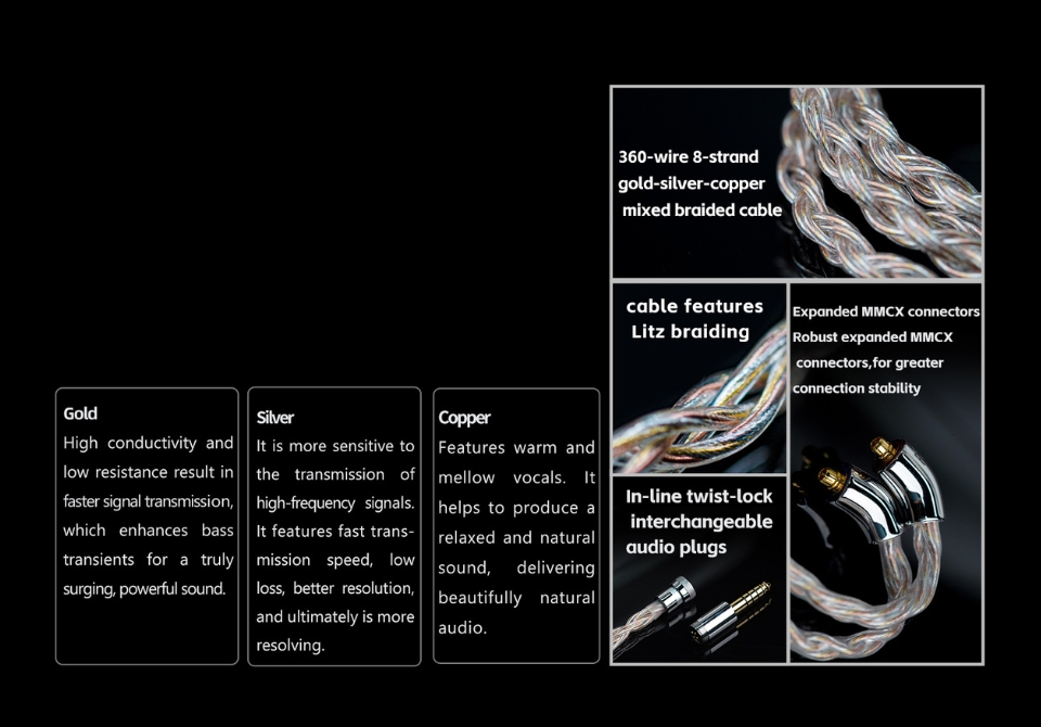 - Wysokiej klasy kabel z przewodnikami ze złota, srebra i miedzi dla maksymalnej transmisji sygnału