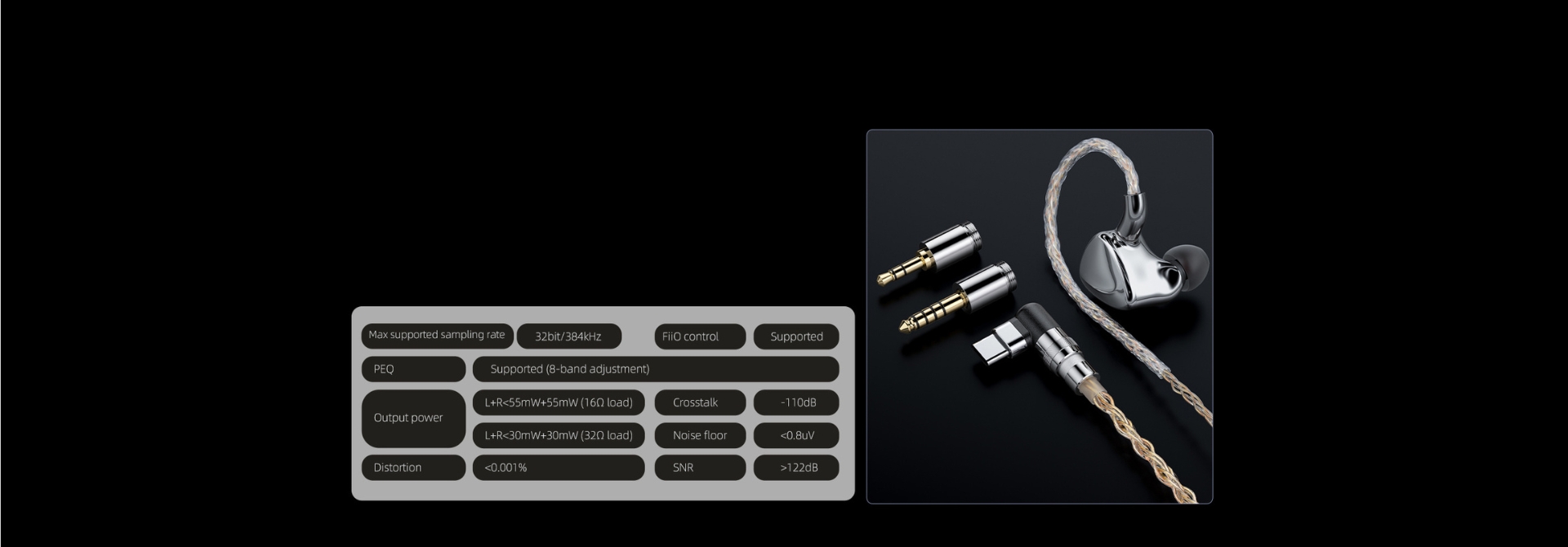 Wymienna wtyczka typu C została wyposażona w zaawansowany układ dekodowania dźwięku DSP, który obsługuje sygnał PCM o wysokiej rozdzielczości do 32 bitów/384 kHz oraz zbalansowane wyjście. Ponadto oferuje 8-pasmowy PEQ o wysokiej precyzji, umożliwiający dostosowanie charakterystyki brzmienia. Dzięki zastrzeżonemu algorytmowi FIIO oraz aplikacji FIIO Control lub interfejsowi PEQ, użytkownik może symulować i korygować krzywą odpowiedzi częstotliwościowej słuchawek, a także eksportować, importować, udostępniać i zapisywać krzywe EQ.
