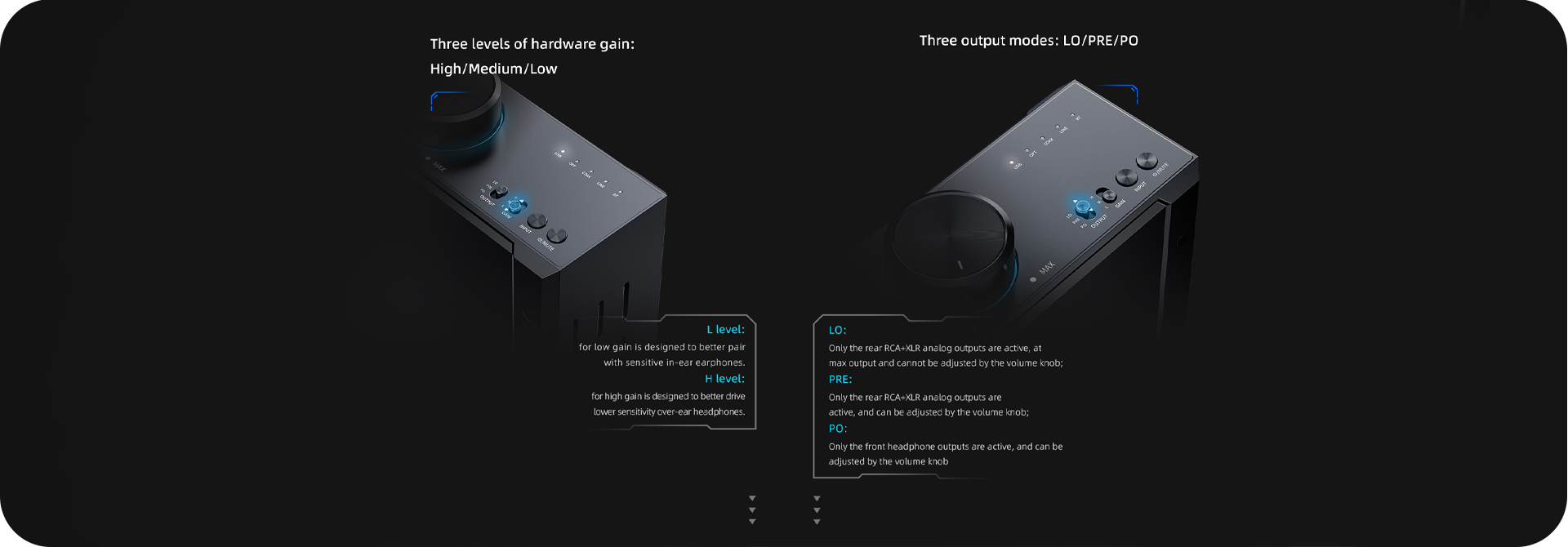 Kultowe, masywne pokrętło głośności FIIO jest zasilane przez rekonstrukcję krzywej ADC, co pozwala na precyzyjną i płynną regulację w obrębie 120 poziomów głośności, przy minimalnym szumie i odchyleniach głośności pomiędzy lewym i prawym kanałem.