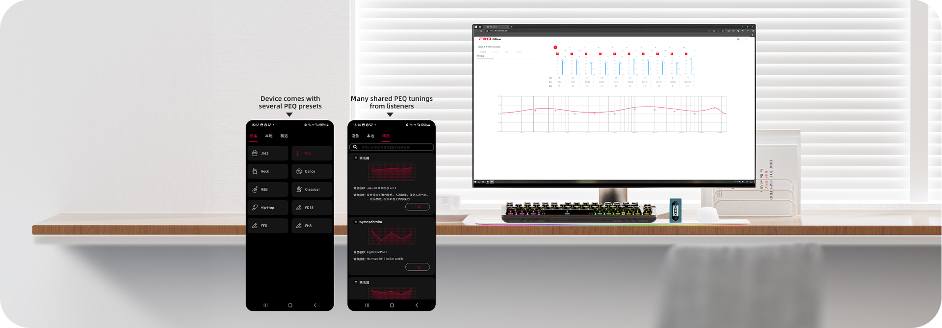 Audiofilski DSP pozwala KA15 na wykorzystanie dziesięciopasmowego, precyzyjnego, bezstratnego korektora PEQ, który działa płynnie i z wysoką jakością dzięki samodzielnie opracowanym przez FIIO zaawansowanym algorytmom regulacji. Za pomocą aplikacji sterującej lub interfejsu internetowego* możesz nie tylko symulować lub korygować krzywą odpowiedzi częstotliwościowej słuchawek, ale także eksportować, importować, udostępniać i zapisywać krzywe EQ. Niezależnie od tego, czy zdecydujesz się na użycie oficjalnie zalecanych strojeń, czy też udostępnisz swoje strojenia online innym użytkownikom, możesz łatwo cieszyć się konfiguracją EQ tak, jak chcesz.