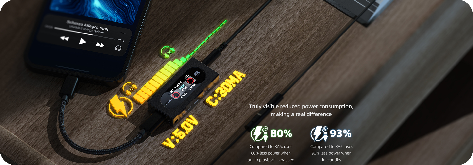 Wyposażony w wydajny, energooszczędny procesor i precyzyjne układy scalone, KA15 oferuje innowacyjne monitorowanie napięcia i prądu w czasie rzeczywistym w celu dynamicznej regulacji mocy. Rozpoznając stan odtwarzania urządzenia, inteligentnie dostosowuje ogólne zużycie energii, dzięki czemu Twój telefon działa przy mniejszym poborze prądu. Gdy ustawisz timer odtwarzania muzyki w nocy, po zakończeniu odliczania KA15 przejdzie w tryb uśpienia o bardzo niskim zużyciu energii — dzięki czemu nie musisz się martwić, że bateria telefonu będzie słaba, gdy obudzisz się następnego dnia.