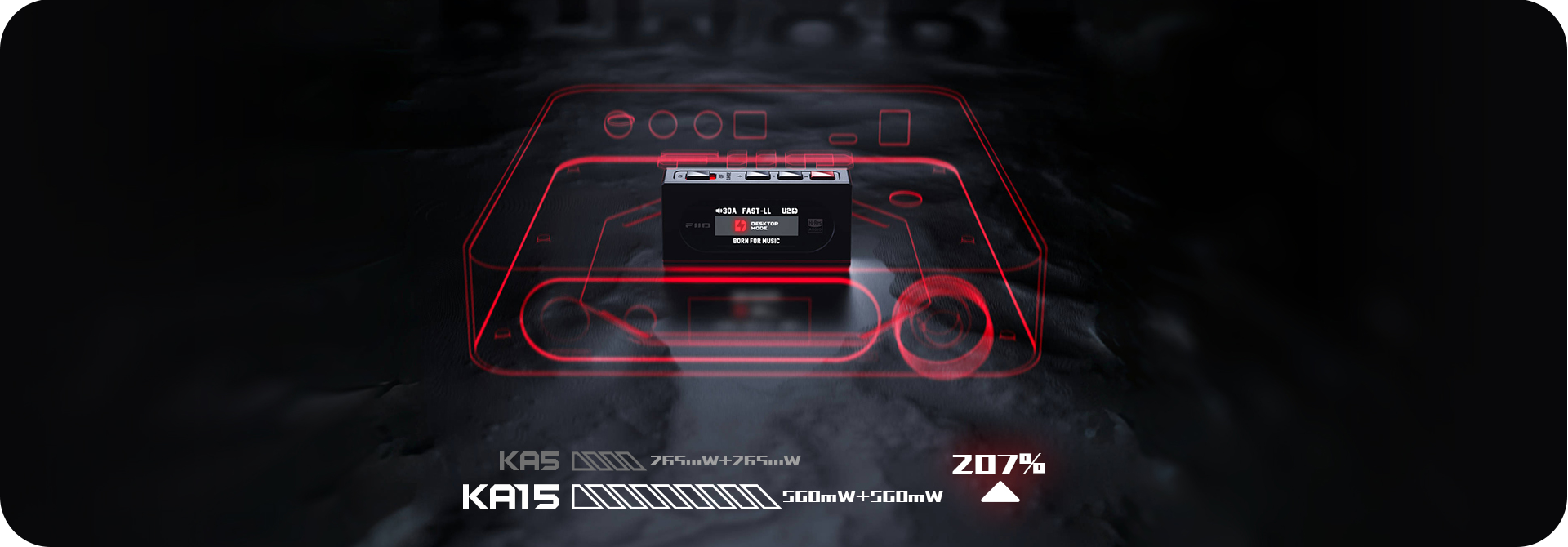 Aktywuj tryb Desktop Mode, aby uzyskać większą moc, ze zbalansowaną mocą wyjściową 560 mW + 560 mW, co stanowi niesamowity wzrost o 207% w porównaniu do KA5. Daje to KA15 przestrzeń do napędzania słuchawek o niskiej i wysokiej impedancji.