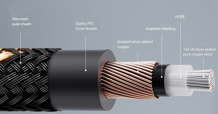 Warstwa ekranująca została wykonana z folii aluminiowej pokrytej grafenem, która owija się pod kątem 360 stopni wokół wewnętrznych 128 plecionych, posrebrzanych miedzianych przewodów uziemiających. W ten sposób przewody rdzenia działają jak bardzo skuteczny ekran, który skutecznie izoluje zakłócenia zewnętrzne, umożliwiając czystsze przesyłanie sygnałów.