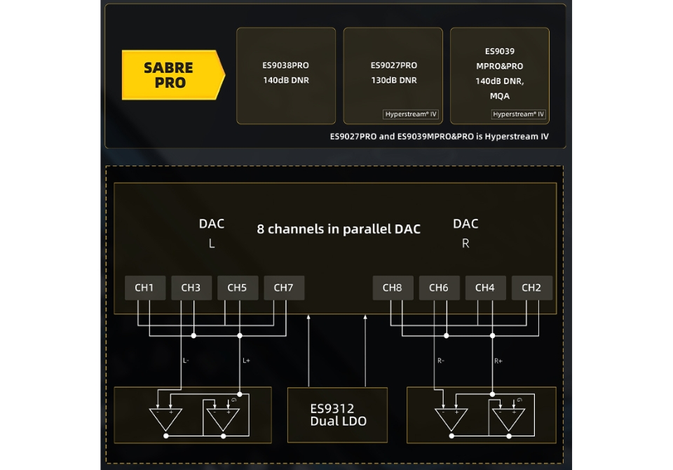 FIIO QX13 wykorzystuje flagowy przetwornik cyfrowo-analogowy ESS SABRE PRO ES9027PRO, zaprojektowany w oparciu o w pełni różnicową architekturę audio. Chip pracuje na ośmiu równolegle skonfigurowanych kanałach, co zapewnia znakomitą precyzję i czystość przetwarzanego sygnału.