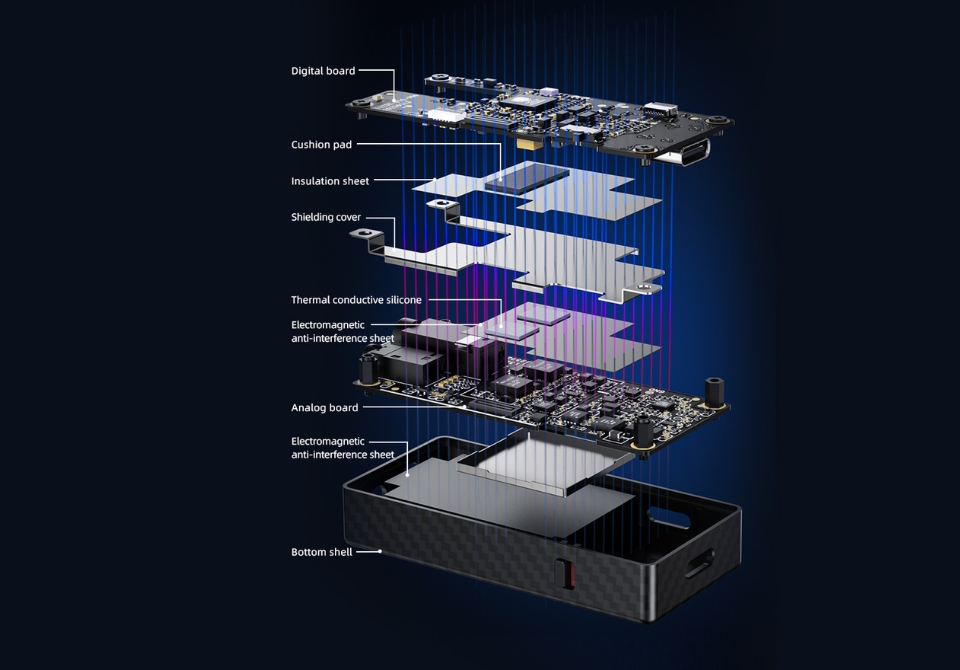 QX13 został zaprojektowany z oddzielnymi torami cyfrowymi i analogowymi, które umieszczono na osobnych płytkach drukowanych i dodatkowo osłonięto dedykowaną pokrywą ekranującą. Takie rozwiązanie skutecznie eliminuje zakłócenia, zapewniając wyjątkową precyzję oraz dynamiczne przetwarzanie sygnału audio.