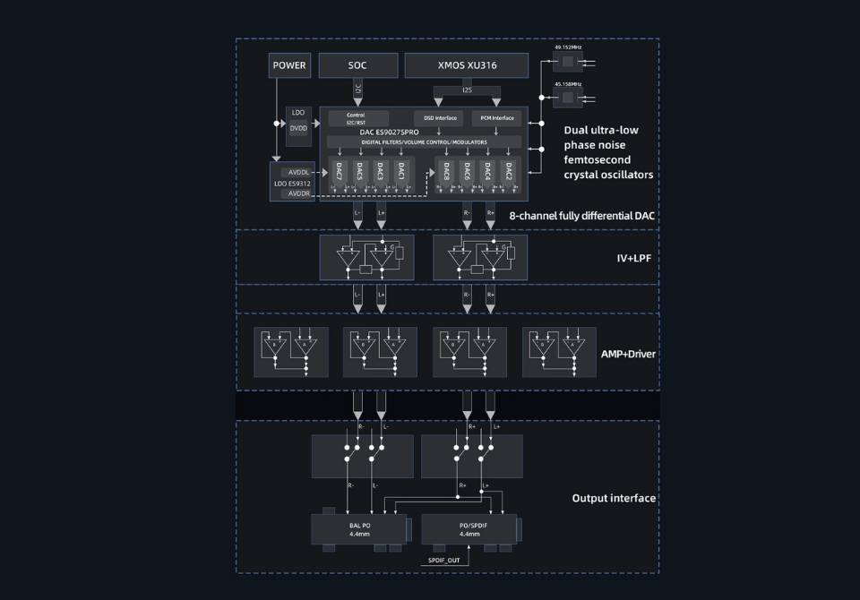 Sygnał analogowy przechodzi przez kilka etapów obróbki: wzmacnianie napięcia (LPF), podbijanie prądu (BUF) oraz równoległą rozbudowę prądową, co skutkuje jakością dźwięku porównywalną z profesjonalnymi zestawami audio.