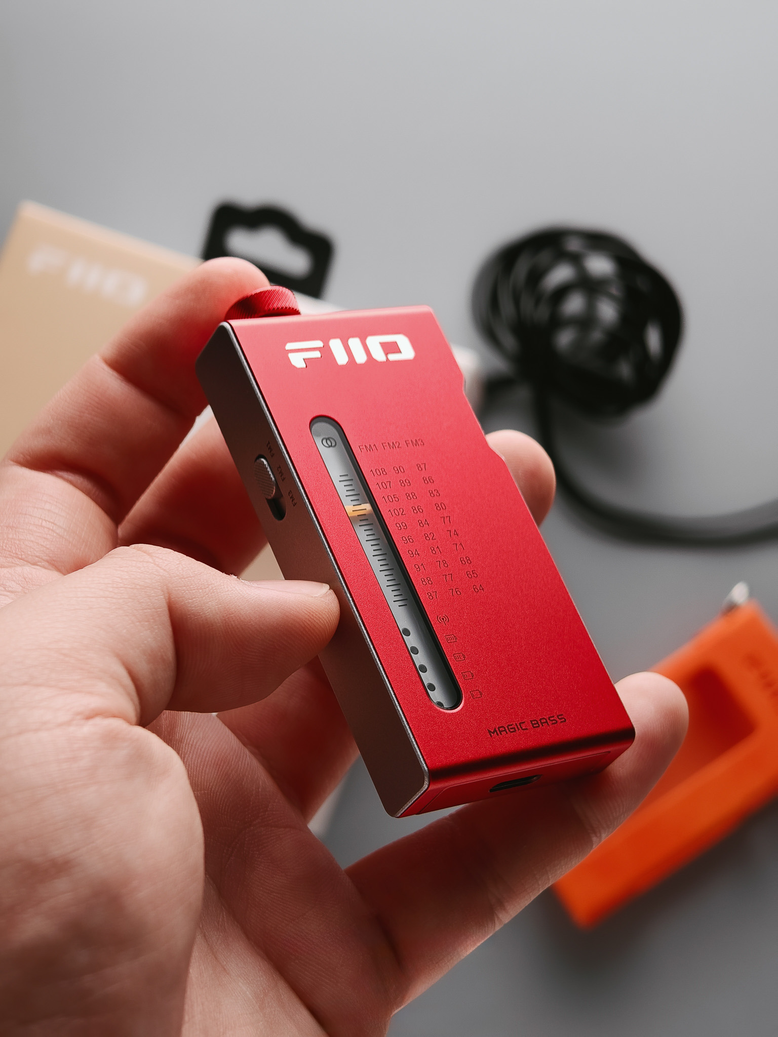 Aby łatwo i precyzyjnie regulować pasmo częstotliwości, FiiO RR11 wyposażono w pokrętło zaprojektowane tak, aby symulować analogowe dostrajanie PVR. Opuszek palca przesuwa się, aby uchwycić częstotliwość każdej stacji radiowej, a retro design pokrętła daje zabawne i nostalgiczne uczucie. Zapewnia to rodzaj natychmiastowej informacji zwrotnej, której nie mogą zapewnić cyfrowe urządzenia do strojenia. Tuż pod oznaczeniem pasma FM wydrukowanym na przednim panelu znajduje się również zestaw wskaźników LED, które wyraźnie pokazują aktywny stan baterii. Te wskaźniki LED świecą również w retro pomarańczowym kolorze, co potęguje nostalgiczne wrażenia.