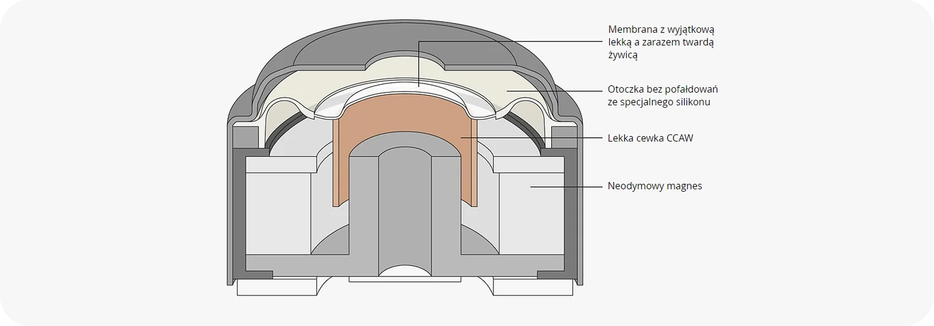 Membrana słuchawek normalnie wykonana jest z folii integralnie uformowanej z krawędzią za pomocą żywicy, gdzie krawędź styczna nakładana jest na membranę. W przypadku małych przetworników z powodu zbyt dużych odchyleń generuje to zniekształcenia. W przetworniku f-core for Wireless zastosowano specjalną żywicę, która jest zarówno lekka jak i twarda. Krawędzie wokół membrany wykonane są ze niezwykle elastycznego silikonu, który zapewnia płynną, wolną od zniekształceń amplitudę membrany. Oddzielając krawędź i 6 mm membranę, uzyskaliśmy powierzchnię membrany odpowiadającą przetwornikowi 9 mm , który wykorzystuje krawędź styczną i efektywnie obniża wychylenia amplitudy oraz niweluje zniekształcenia. Co więcej, specjalna silikonowa krawędź i membrana są bezpośrednio skompresowane termicznie, co znacznie poprawia dokładność montażu i minimalizuje różnice między przetwornikami. Ponadto, do membrany nie został zastosowany klej co znacznie zmniejsza wagę słuchawek a dźwiękowo minimalizuje zniekształcenia.