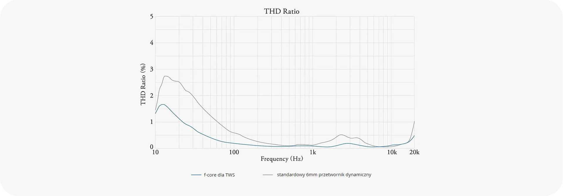 Doskonały sprzęt audio, wzmacniacze i inny sprzęt elektroniczny mają wyjątkowo niskie zniekształcenia rzędu 0,0001%. Jednakże zniekształcenia generowane przez przetwornik (głośniczek) wewnątrz słuchawek wynoszą 1% lub więcej w paśmie niskich częstotliwości. Innymi słowy w procesie przetwarzania sygnału elektrycznego na dźwięk przez przetwornik generowane jest zniekształcenie 10 000 razy większe. Gdybyśmy mogli znacznie to zredukować, jakość dźwięku uległaby niesamowitej poprawie. Jak wiemy, bezprzewodowe słuchawki zazwyczaj są wyposażone w korektor programowy jako rozwiązanie tego problemu, jednak przy dłuższych odsłuchach powoduje to zmęczenie. W słuchawkach ZE2000 wyregulowano jakość dźwięku tak aby była zadowalająca bez użycia korektora dzięki poprawie wydajności przetwornika oraz poprawę akustyki wewnątrz komory obudowy. Korektora użyto jedynie do zmniejszenia ciśnienia akustycznego z precyzją tylko w wąskim paśmie. Aby ta regulacja była efektywna wymagany jest przetwornik o niezwykle dokładnej charakterystyce częstotliwości ciśnienia akustycznego. Jeśli jest standardowa zmienność około 3dB to korekta ta przyniesie nienaturalne rezultaty. Aby rozwiązać powyższe problemy opracowaliśmy całkowicie od podstaw, nowatorski przetwornik f-core for Wireless.