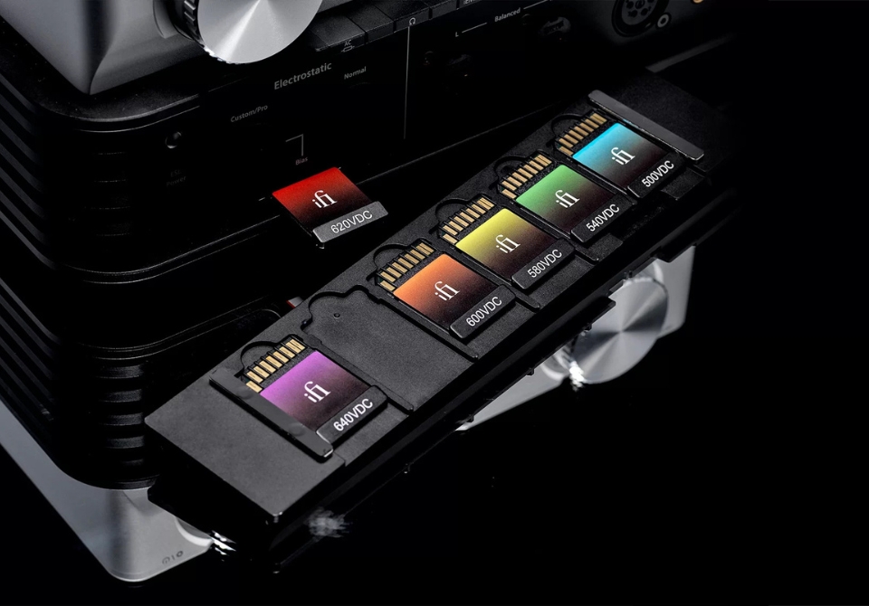 Aby wyeliminować ryzyko błędnych ustawień, iCAN Phantom został wyposażony w zestaw kart danych, dostarczanych wraz ze wzmacniaczem. Każda karta odpowiada określonemu poziomowi napięcia polaryzacji — 500V, 540V, 580V, 600V, 620V i 640V — i zawiera praktyczny przewodnik, który wskazuje, które marki i modele słuchawek są kompatybilne z danym napięciem. Wystarczy wybrać odpowiednią kartę i umieścić ją w dedykowanym gnieździe, co gwarantuje bezpieczną i optymalną konfigurację.