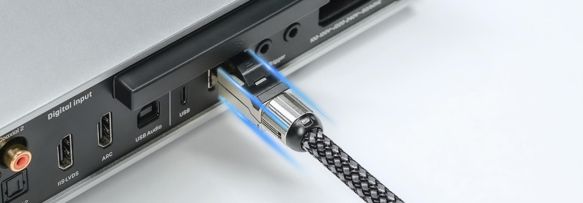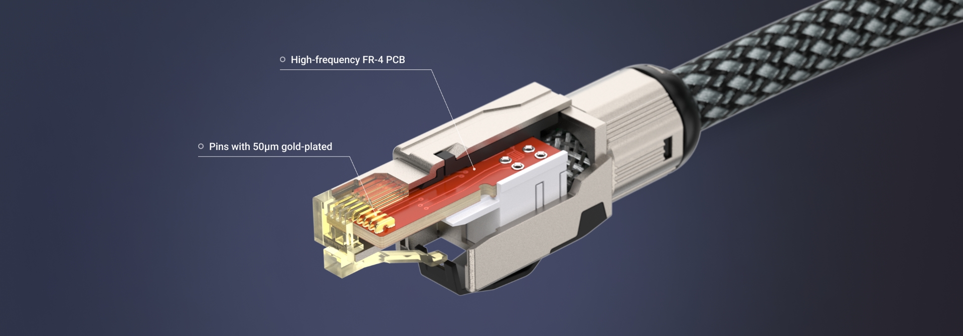 Złącze RJ45 wyposażono w w pełni ekranowaną, metalową obudowę, spełniającą standard prędkości Cat.6A 10 Gigabit. Styki wtyku pokryto 50-mikronową warstwą złota, co skutkuje wyjątkowo niską rezystancją styku. Wewnątrz zastosowano płytkę PCB wykonaną z wysokoczęstotliwościowego laminatu FR-4, co zapewnia stabilną impedancję transmisyjną — idealną do przesyłania wysokiej rozdzielczości dźwięku przez sieć.