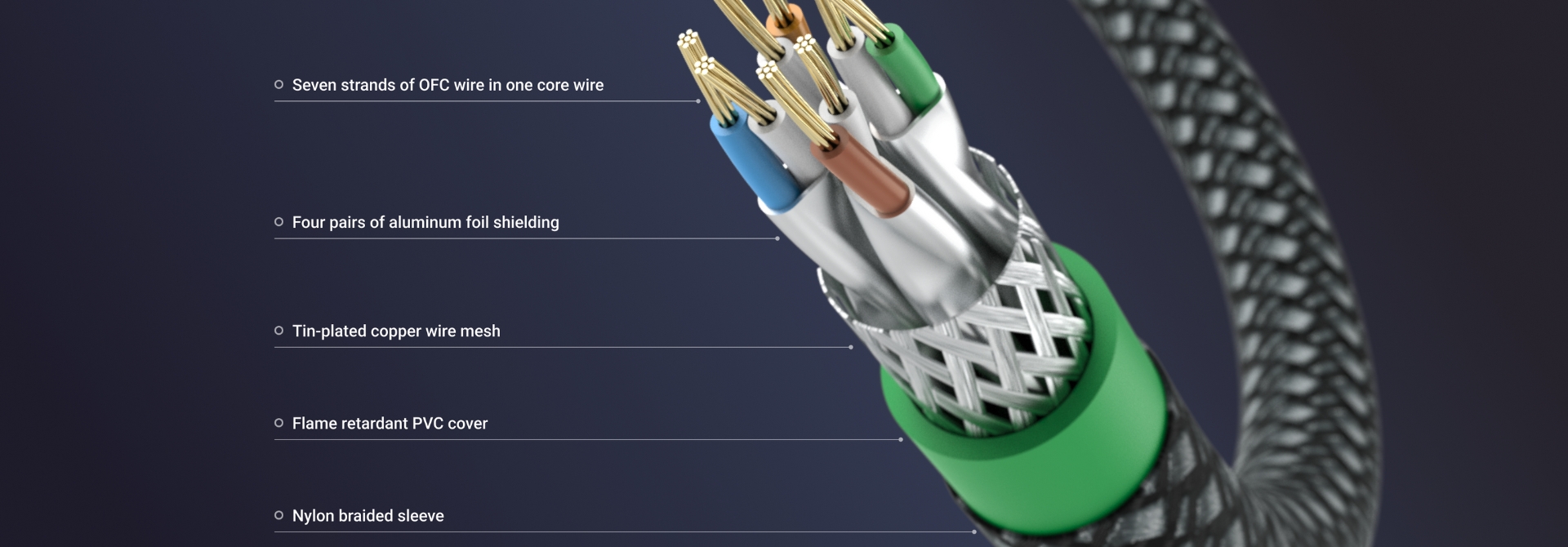 Firma Matrix Audio wykorzystuje w swoich kablach sieciowych przewody wielożyłowe, odróżniające się od tradycyjnych konstrukcji jednożyłowych. Każdy kabel składa się z czterech par skręconych przewodów, z których każdy zawiera siedem żył wykonanych z miedzi beztlenowej (OFC) o średnicy 0,16 mm. Każda para żył posiada indywidualne ekranowanie z folii aluminiowej, a całość dodatkowo chroni warstwa z siatki miedzianej cynowanej, skutecznie eliminująca przesłuchy wewnętrzne i zakłócenia zewnętrzne. Dzięki temu przewód bez trudu obsługuje transmisję w standardzie 10 Gigabit Ethernet.