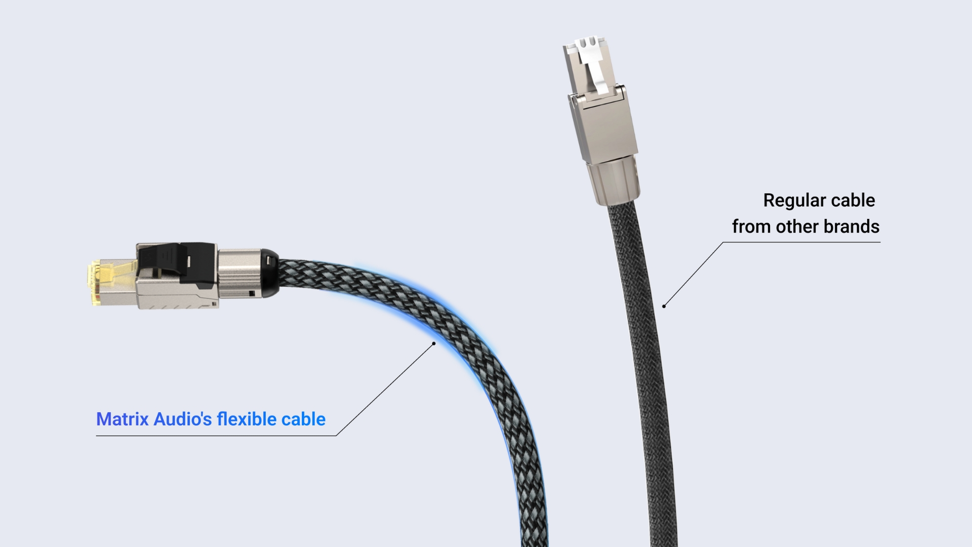 Dzięki miękkiej konstrukcji przewodów wielożyłowych, kable sieciowe Matrix Audio zachowują elastyczność, jednocześnie spełniając wymagania standardu 10 Gigabit Ethernet. Taka budowa zapobiega wywieraniu nacisku przez sztywny przewód na gniazdo sieciowe urządzenia, eliminując ryzyko pogorszenia styku lub uszkodzenia portu przy dłuższym użytkowaniu.