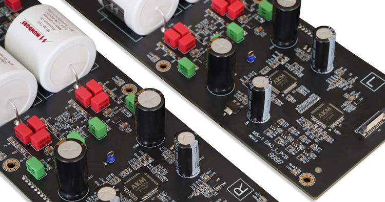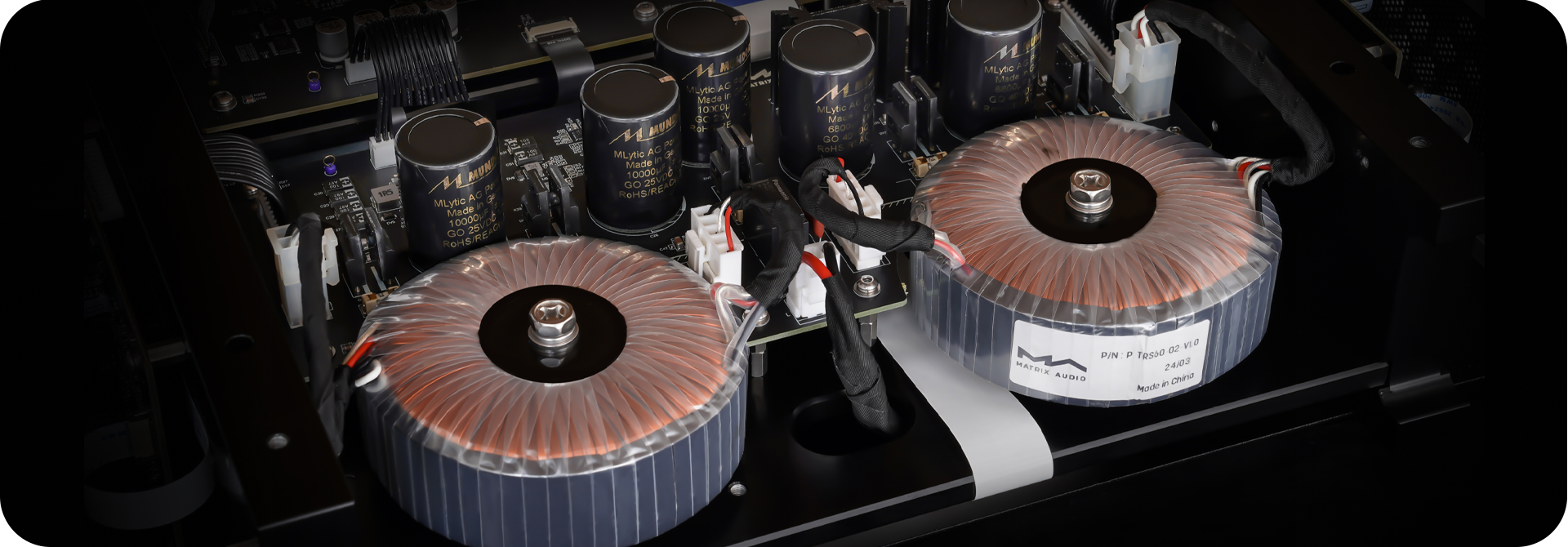 Moc jest punktem wyjścia systemu audio. Dostosowaliśmy dwa toroidalne transformatory dużej mocy z kwadratowym przewodem miedzianym do sekcji cyfrowej i analogowej MS-1. W porównaniu do tradycyjnych transformatorów toroidalnych z przewodem o przekroju kołowym, kwadratowy przewód miedziany ma większą powierzchnię przewodzącą, większą pojemność prądową i niższą rezystancję, co skutkuje lepszą odpowiedzią przejściową i bogatszymi niskimi częstotliwościami. W połączeniu z kondensatorami filtrującymi serii M-Lytic AG firmy MUNDORF dodaje jedwabistą gładkość i łagodność do dźwięku. Dziesiątki niskoszumowych LDO i ultraniskoszumowych LDO zapewniają wystarczające zasilanie dla każdej jednostki obwodowej, nawet włączając SSD, dążąc do doskonałości na każdym etapie.