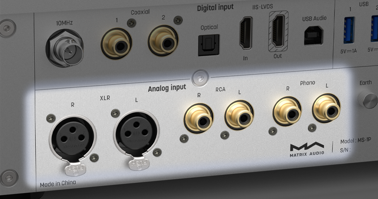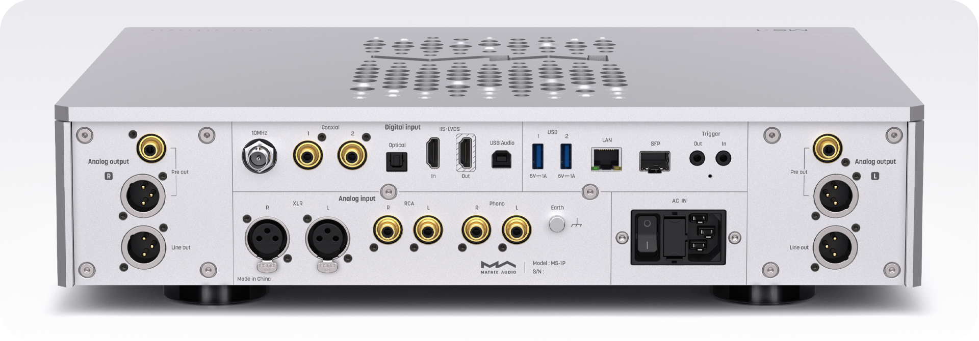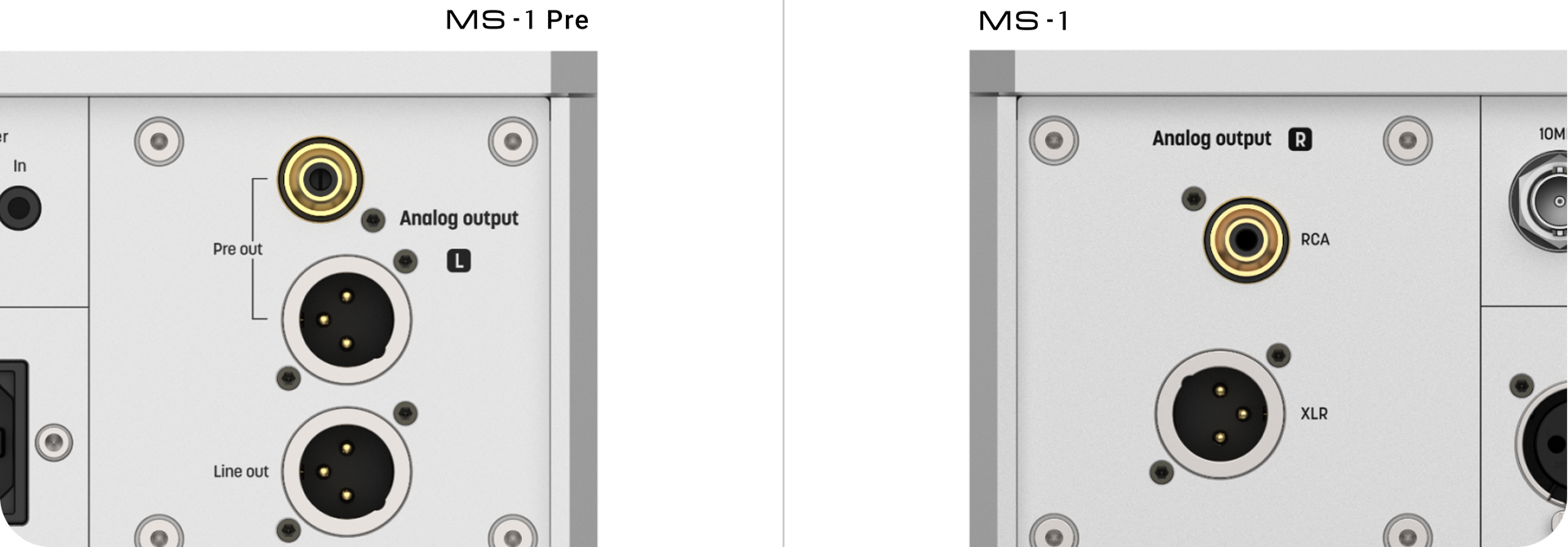MS-1 ma dwie pary wejść liniowych i jedną parę wejść gramofonowych. Dzięki wejściom liniowym XLR i RCA możesz zintegrować dowolne urządzenie z wyjściem analogowym z cyfrowym systemem audio. Wbudowany przedwzmacniacz gramofonowy obsługuje tryby MM i MC, umożliwiając bezpośrednie podłączenie do gramofonu winylowego. Wszystkie analogowe wejścia audio są konwertowane na dźwięk cyfrowy za pomocą precyzyjnego przetwornika ADC, agregowane w jednostce przetwarzania cyfrowego i stosowane są filtry PCM. Sygnały te mogą być również wyprowadzane z portu IIS-LVDS