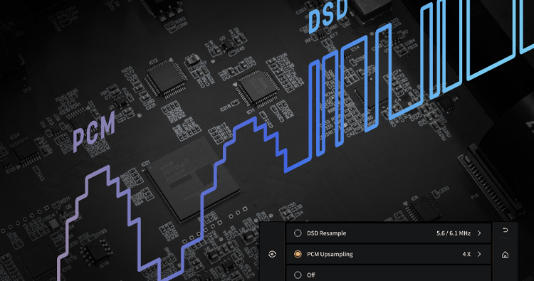 Możesz pozwolić wbudowanemu asynchronicznemu upsamplingowi i silnikowi konwersji DSD przetworzyć wszystkie dane audio w etapie cyfrowym. Dzięki asynchronicznym operacjom resamplingu i interpolacji drgania zostaną odizolowane, a szczegóły ulepszone. Konwerter DSD przekształca cały odtwarzany dźwięk w DSD, zwiększając gęstość dźwięku. Silnik przetwarzania oferuje konfigurowalne konfiguracje konwersji PCM lub DSD, co pozwala doświadczyć różnic w dźwięku przy różnych ustawieniach.