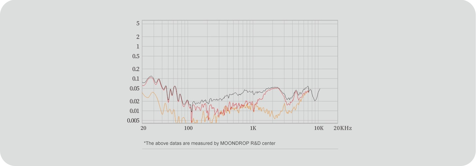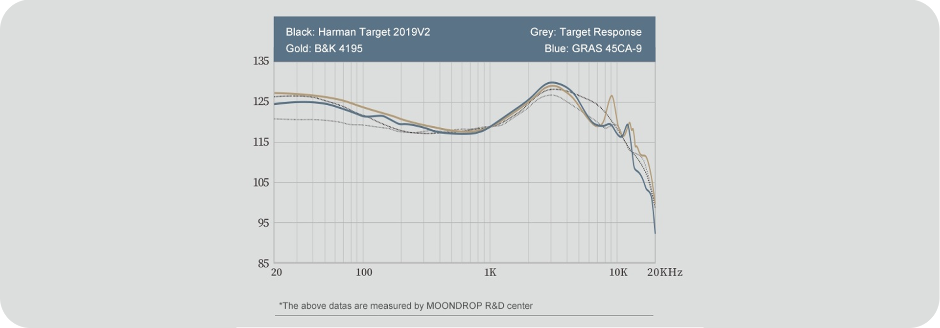 *Odpowiedź docelowa MOONDROP VDSF to docelowa krzywa odpowiedzi częstotliwościowej oparta na HRTF (Head Related Transfer Function) B&K HATS w warunkach dyfuzji i krzywej preferencji idealnego pomieszczenia. Im bardziej krzywa odpowiedzi częstotliwościowej zmierzona w ramach B&K HATS jest bliżej docelowej krzywej odpowiedzi częstotliwościowej, tym lepiej słuchawki mogą odtworzyć obraz sceny dźwiękowej pod względem charakterystyki częstotliwościowej.