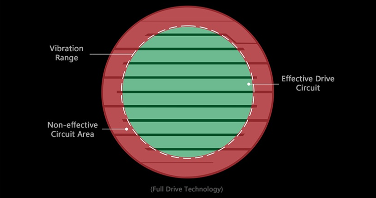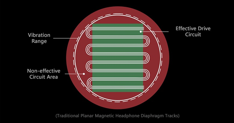 Wibrująca część membrany umieszczona jest w jednolitym, planarnym polu magnetycznym, a efektywne obwody napędowe rozciągają się na całej powierzchni drgającej powierzchni. Wywiera to jednolitą siłę napędową na całej powierzchni, porównywalną do tej w słuchawkach elektrostatycznych, eliminując rozszczepione wibracje i zapewniając wydajność wysokich tonów znacznie lepszą niż w przypadku tradycyjnych planarnych słuchawek magnetycznych.