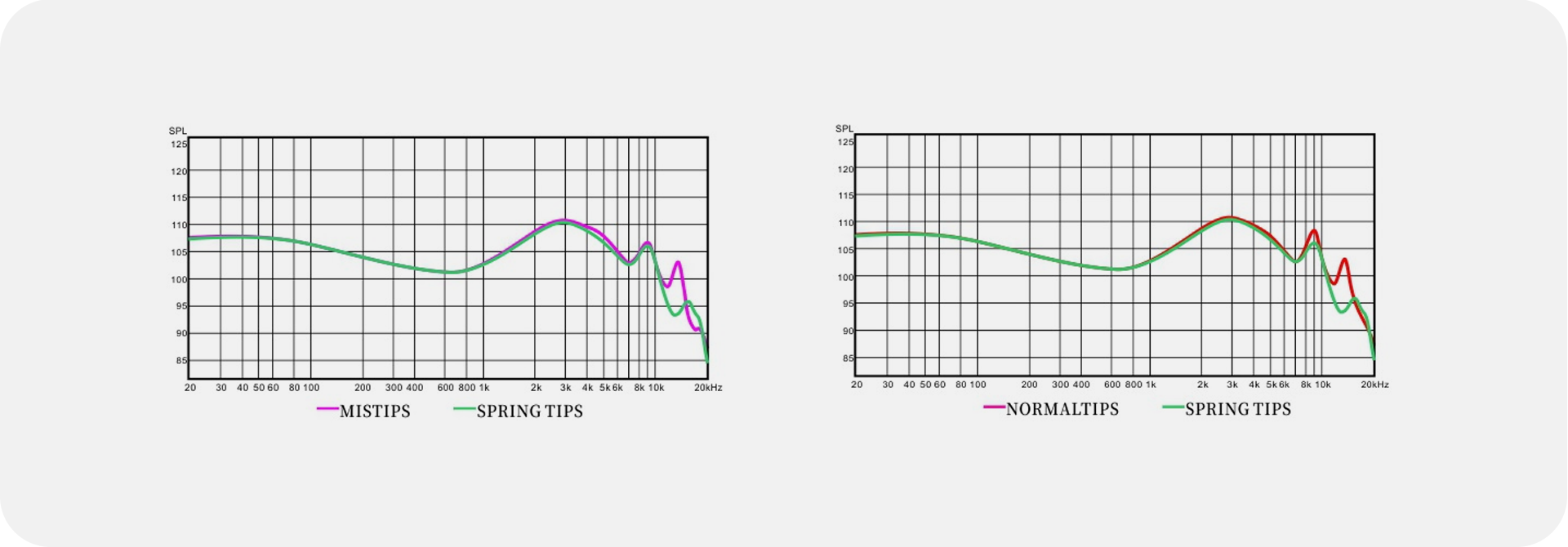 Rzeczywisty pomiar krzywej odpowiedzi częstotliwościowej dopasowanej do słuchawek wyraźnie pokazał, że końcówki Spring Tip potrafią znacząco tłumić szczyt rezonansu wysokich tonów generowany przez połączenie końcówek dousznych z naszym kanałem słuchowym, jeszcze bardziej poprawiając przywracanie barwy wysokich tonów.