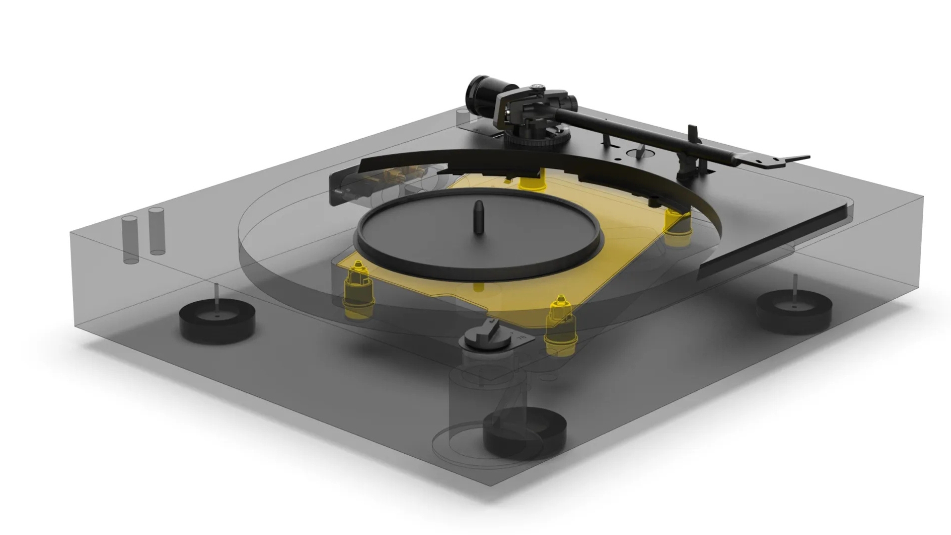 Gramofon A2 został wyposażony w konstrukcję typu sub-chassis, w której najważniejsze elementy – ramię, łożysko talerza oraz silnik – zamontowane są na osobnym, pływającym podzespole. Takie rozwiązanie skutecznie izoluje kluczowe komponenty gramofonu, zapewniając im dodatkową ochronę przed zakłóceniami zewnętrznymi, drganiami i hałasem otoczenia.