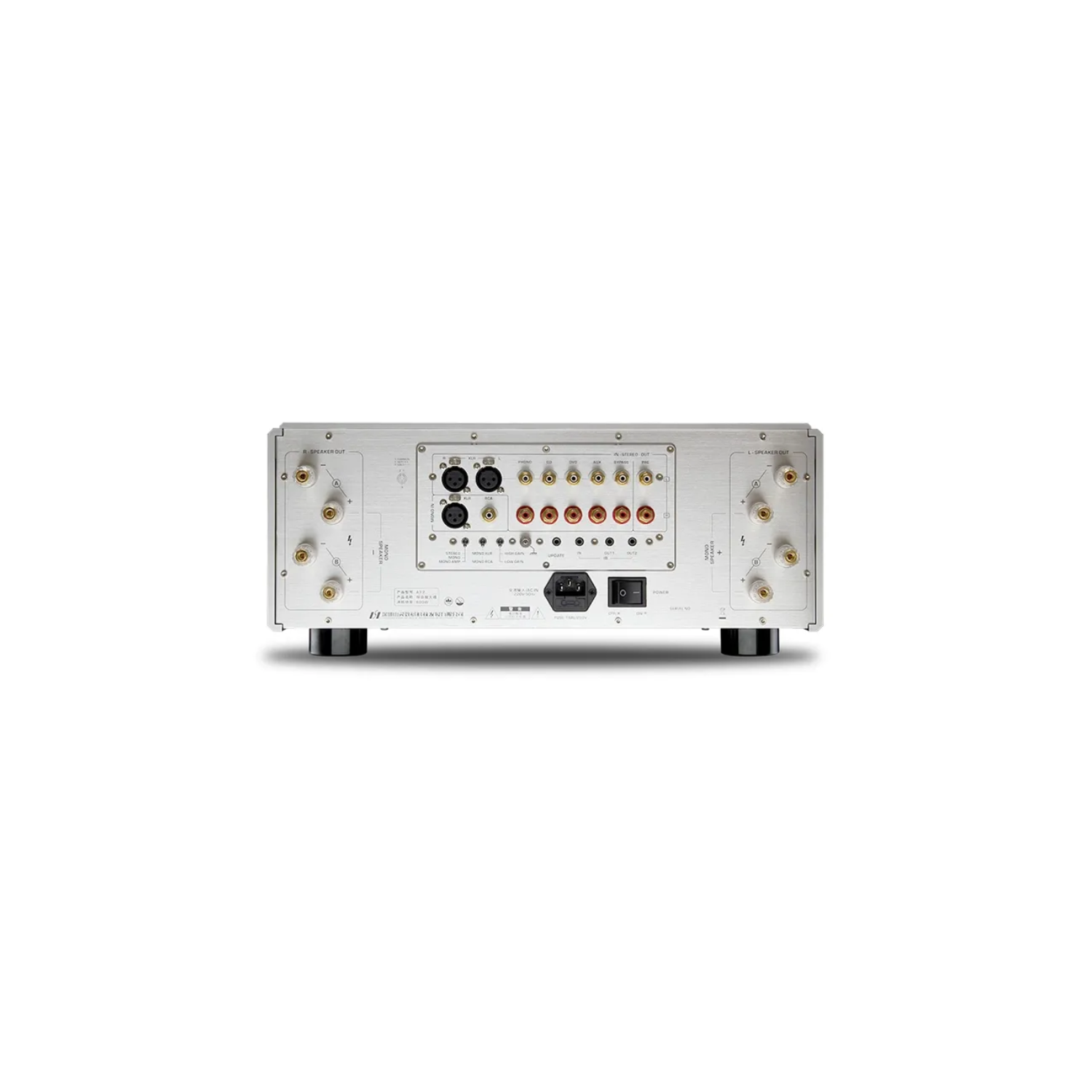 Na froncie wzmacniacza znajduje się stylowy panel z dużymi, wygodnymi przyciskami funkcyjnymi oraz charakterystyczną czarną wstawką, w której umieszczono czytelny ekran OLED – widoczny nawet z większej odległości. Masywna bryła urządzenia nie tylko podkreśla jego prestiżowy charakter, ale również zapewnia stabilność i skutecznie redukuje rezonanse.
