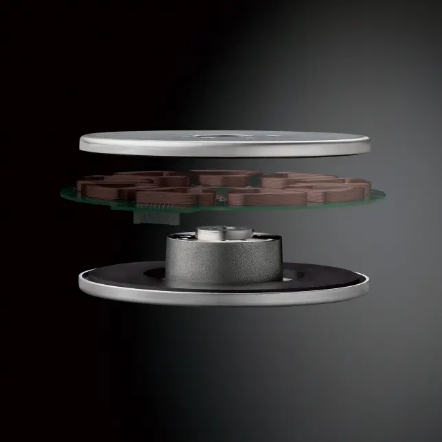 Gramofon wyposażono w trójwarstwowy talerz wykonany z precyzyjnie połączonych materiałów: mosiądzu i aluminium, co zapewnia wyjątkową sztywność konstrukcji. Cała tylna powierzchnia talerza została pokryta gumą tłumiącą, która skutecznie eliminuje niepożądane drgania i zakłócenia, wpływając korzystnie na jakość odtwarzanego dźwięku.