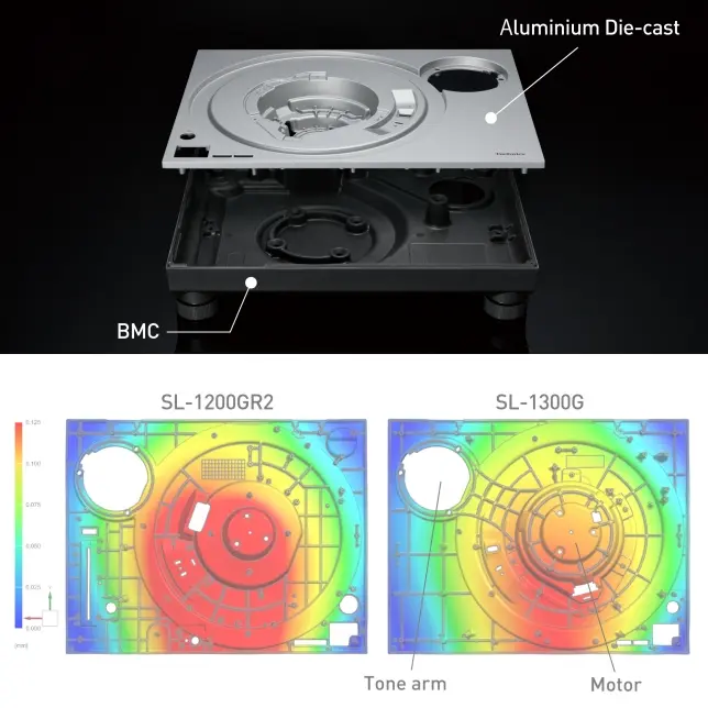 Gramofon SL-1300G wyróżnia się wyjątkową sztywnością konstrukcji dzięki dwuwarstwowej obudowie, łączącej formowaną BMC z aluminiowym korpusem odlewanym ciśnieniowo. Dodatkowe żebra wzmacniające, umieszczone pomiędzy silnikiem a ramieniem tonowym na górnym panelu, znacząco poprawiają stabilność całej struktury oraz efektywność tłumienia drgań. Takie rozwiązanie przekłada się na czystszy dźwięk i większą odporność na zakłócenia zewnętrzne.