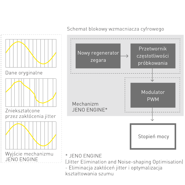 Aby zapewnić bezstratne i wierne odtwarzanie bogatych danych audio przesyłanych do kolumn głośnikowych, wzmacniacz mocy SU-G700M2 został wyposażony w w pełni cyfrowy układ wzmacniający, oparty na koncepcjach referencyjnych systemów marki Technics. Kluczowym elementem tej konstrukcji jest mechanizm JENO, zaprojektowany z myślą o eliminacji zniekształceń typu jitter — częstego problemu w konwencjonalnych wzmacniaczach cyfrowych.