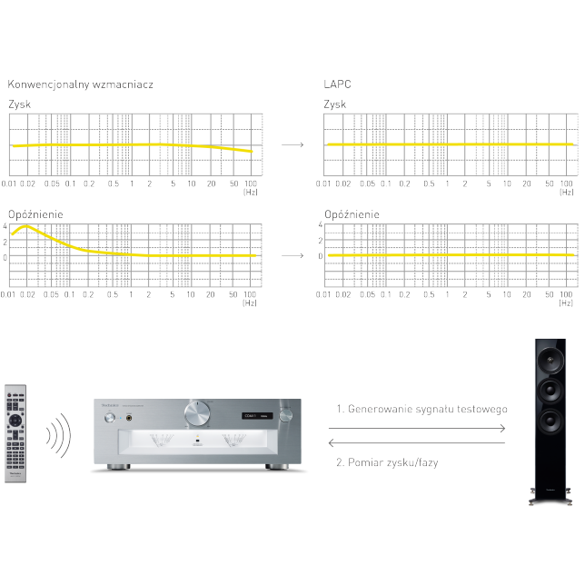 Choć tradycyjne wzmacniacze potrafią korygować charakterystykę amplitudową dzięki zastosowaniu ujemnego sprzężenia zwrotnego, poprawa charakterystyki fazowej pozostawała poza ich zasięgiem. Aby rozwiązać ten problem, opracowano zaawansowany algorytm optymalizacyjny, który umożliwia cyfrową kalibrację fazy poprzez pomiar charakterystyki częstotliwościowej amplitudy i fazy wzmacniacza w odniesieniu do konkretnych głośników.