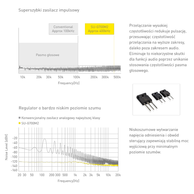 Wzmacniacz SU-G700M2 korzysta z technologii zasilania klasy referencyjnej, znanej z modelu SU-R1000, co przekłada się na większą moc wyjściową i wyraźniejsze poczucie energii w dźwięku. Częstotliwość pracy impulsowej została zwiększona z typowych 100 kHz do 400 kHz, co pozwala na bardziej stabilne dostarczanie napięcia i ograniczenie zakłóceń wynikających z modulacji — kluczowych dla zachowania wysokiej jakości brzmienia.