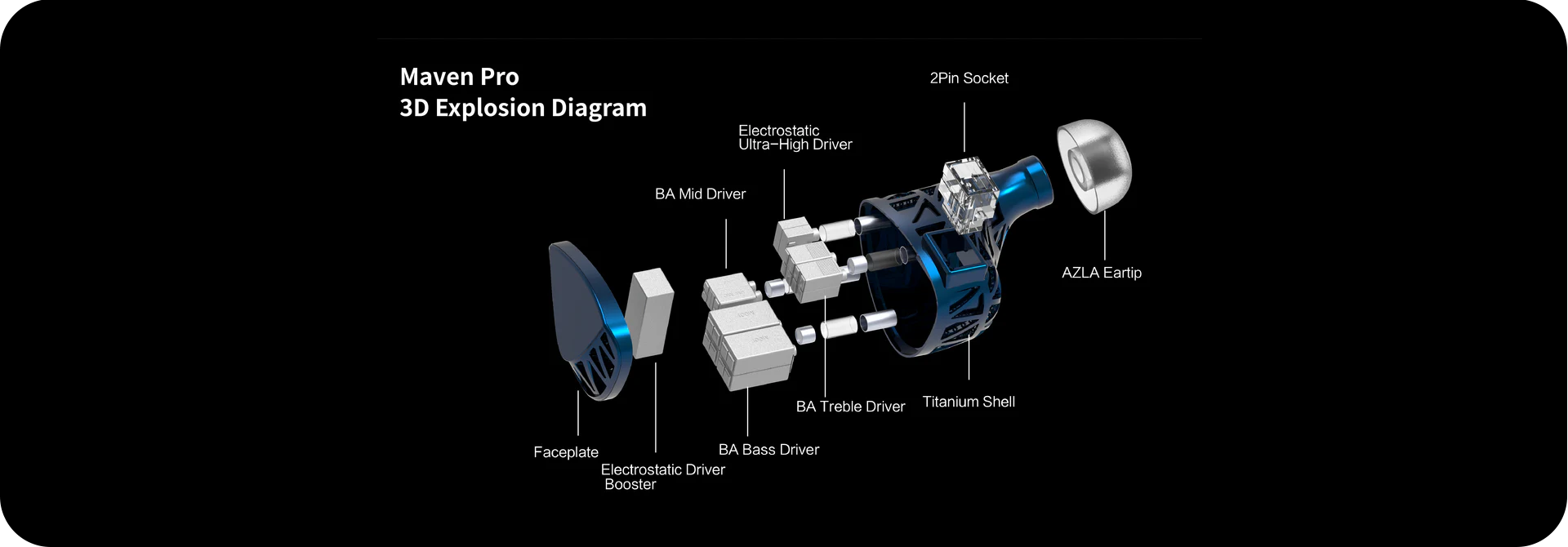 Maven Pro wykorzystuje sterowniki elektrostatyczne do rozszerzenia ultrawysokiej częstotliwości oprócz tradycyjnych zbalansowanych sterowników armaturowych. Zakres odpowiedzi częstotliwościowej może sięgać do 70 kHz. W porównaniu do Maven, Maven Pro ma dostosowaną strukturę zwrotnicy i konfigurację sterowników, co znacznie poprawia odpowiedź basową.