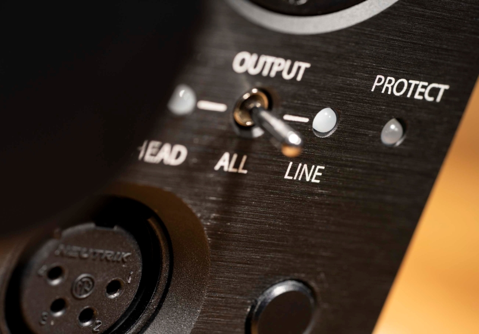 - Wyjścia przełączane z poziomu panelu przedniego (HEAD / OFF / LINE) oraz na tylnym panelu za pomocą przycisku (Line Pre / Post)